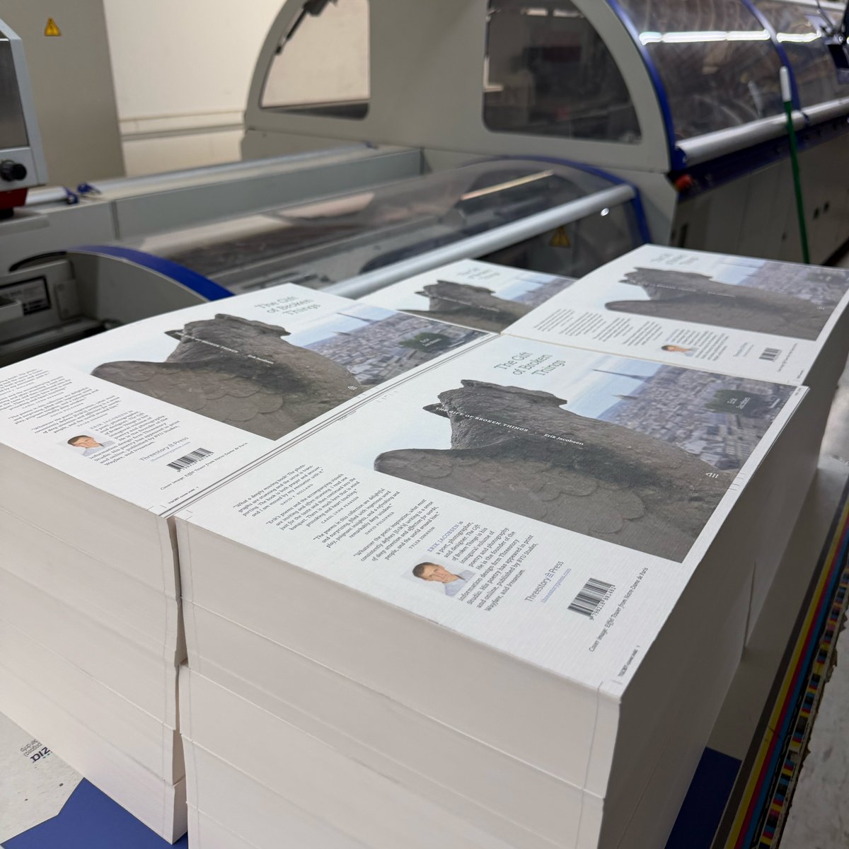 I traveled across the Bay to Online Bindery in Richmond to see them put the final touches on The Gift of Broken Things. Fascinating to watch their equipment in action and thrilling to see the final result. I’m very happy with how it all turned out: the paper quality, the vibrance of the images, the clarity of each poem on the page. Excited to get this into readers’ hands.
